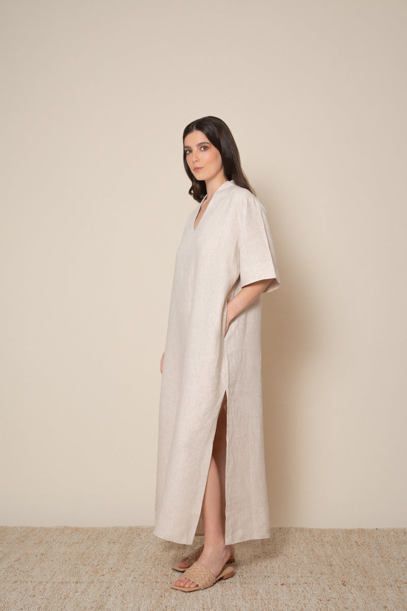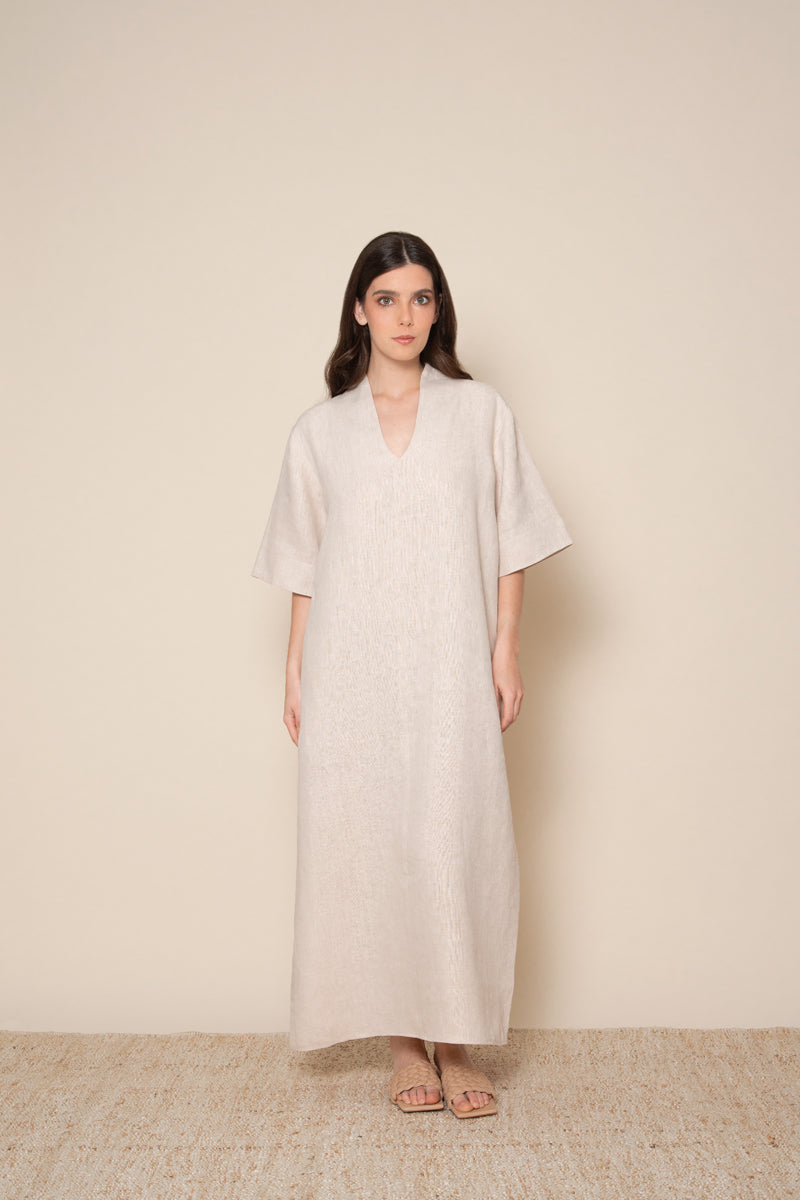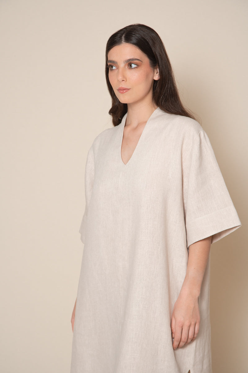 The Essie linen tunic is a piece that effortlessly combines simplicity and comfort. With its clean and minimalistic design, this oversize tunic has a clear relaxed and stylish charm. The straight cut and flowy silhouette ensure a comfortable fit, while the wide half-length sleeves and V-shaped neckline add a touch of elegance. Complete with side slits for enhanced and easy movement and a fresh feel, the Essie tunic is the go-to piece for relaxed sophistication this Summer.