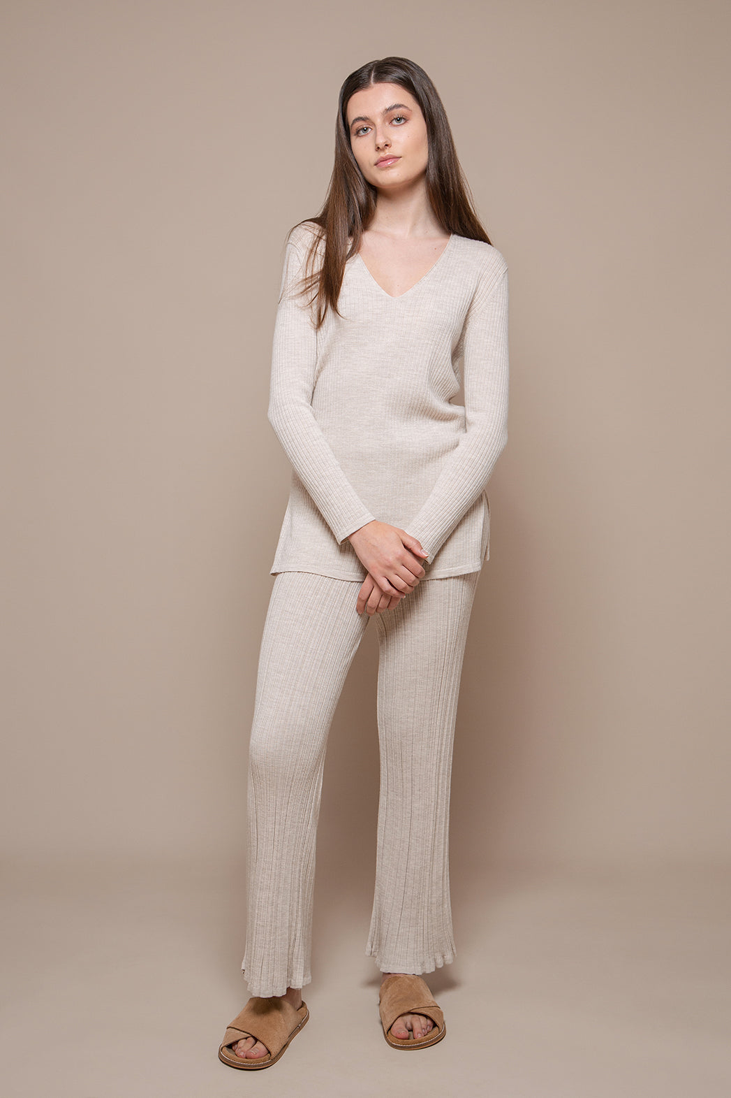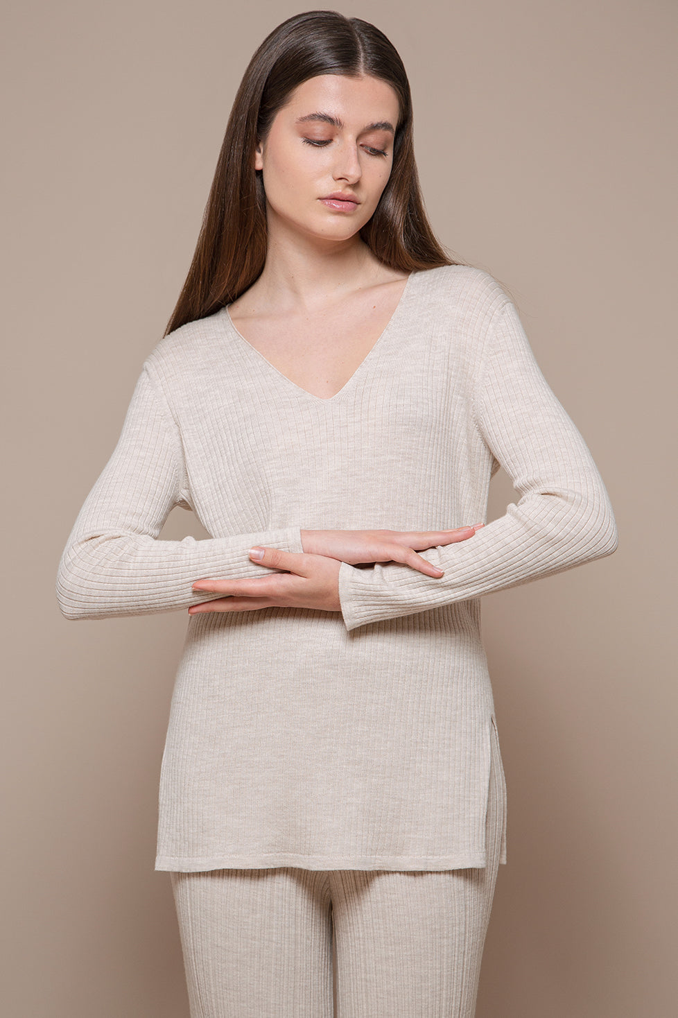 Lucy is a purposefully simple and casual long jumper, with a restrained and considerate design fit for the everyday use, yet complemented with understated graceful details, such as its elegant and moderate v-neck and the uniform and homogeneous rib along the whole piece. The top is made with a smooth Cariaggi wool, very comfortable against the skin, and its breezy lightness makes of this top a perfect choice for a mid-seasonal staple piece. The Lucy jumper is that piece that goes very comfortably and beautifully with knit trousers. Pair it with our Valentina trousers for an effortless look.